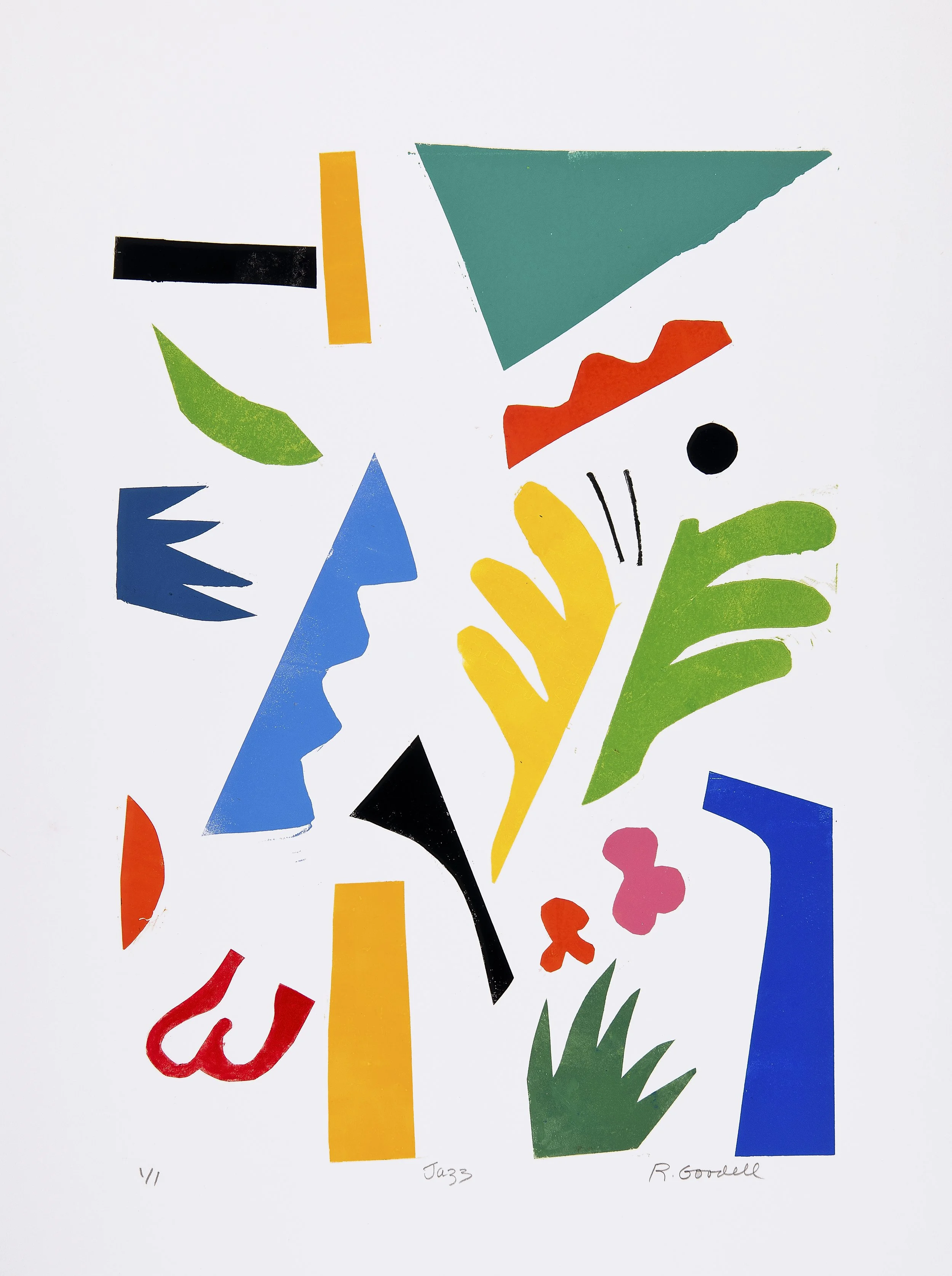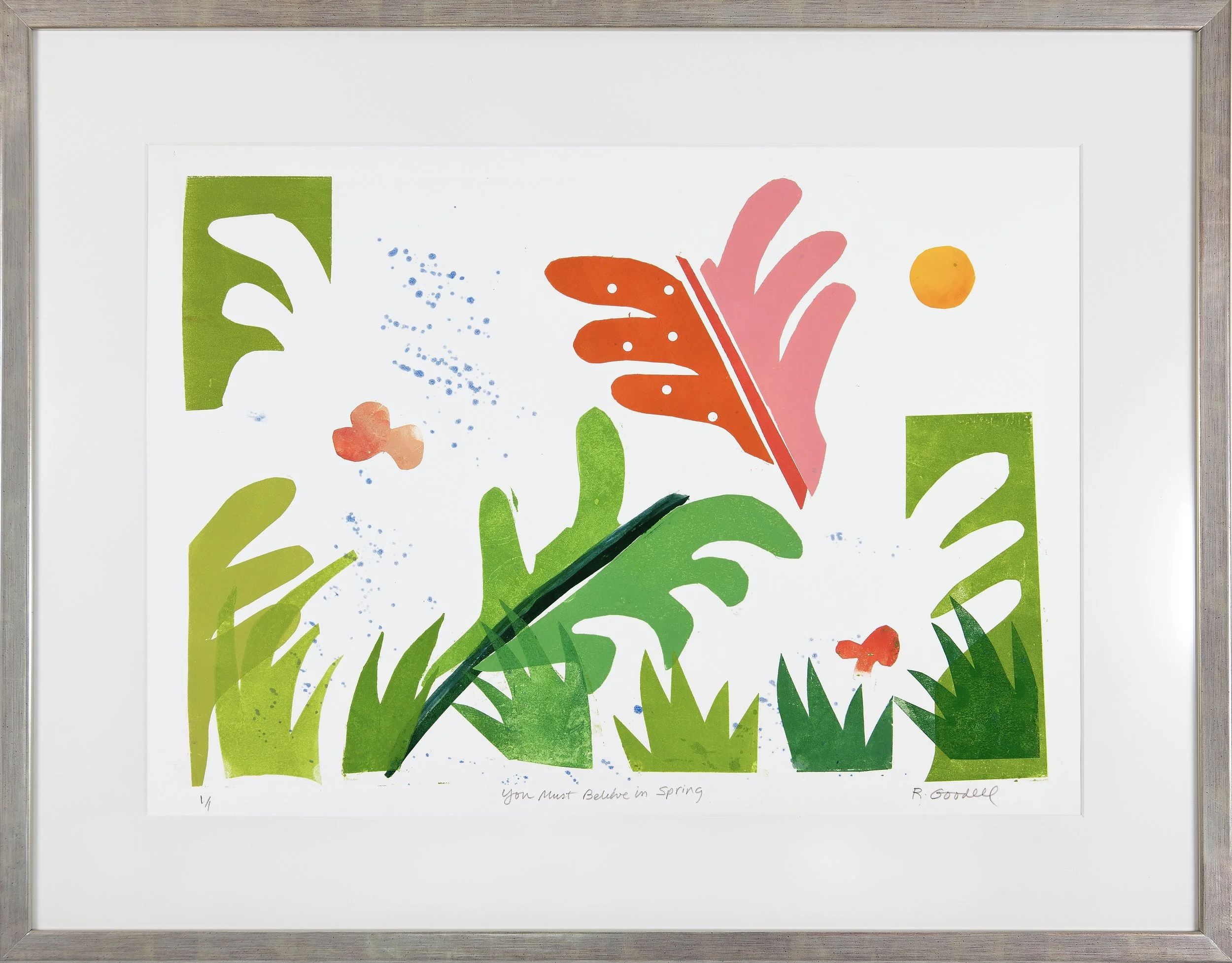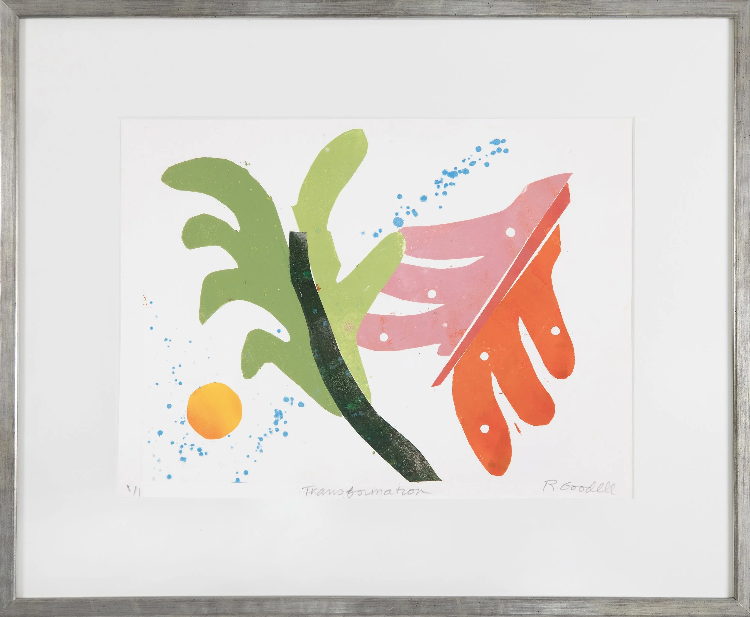 Goodell focuses her studio practice on creating monoprints, a one-of-a-kind print created by arranging pre-inked shapes and patterns onto a plexiglas plate. The plate is then set on a printing bed, covered by acid free paper and run through a heavy press which transfers or “prints” the shapes and colored inks onto the paper. Monoprints are different than other forms of printmaking in that the artist only uses the plate and design once - no exact image or colored arrangement is repeated.