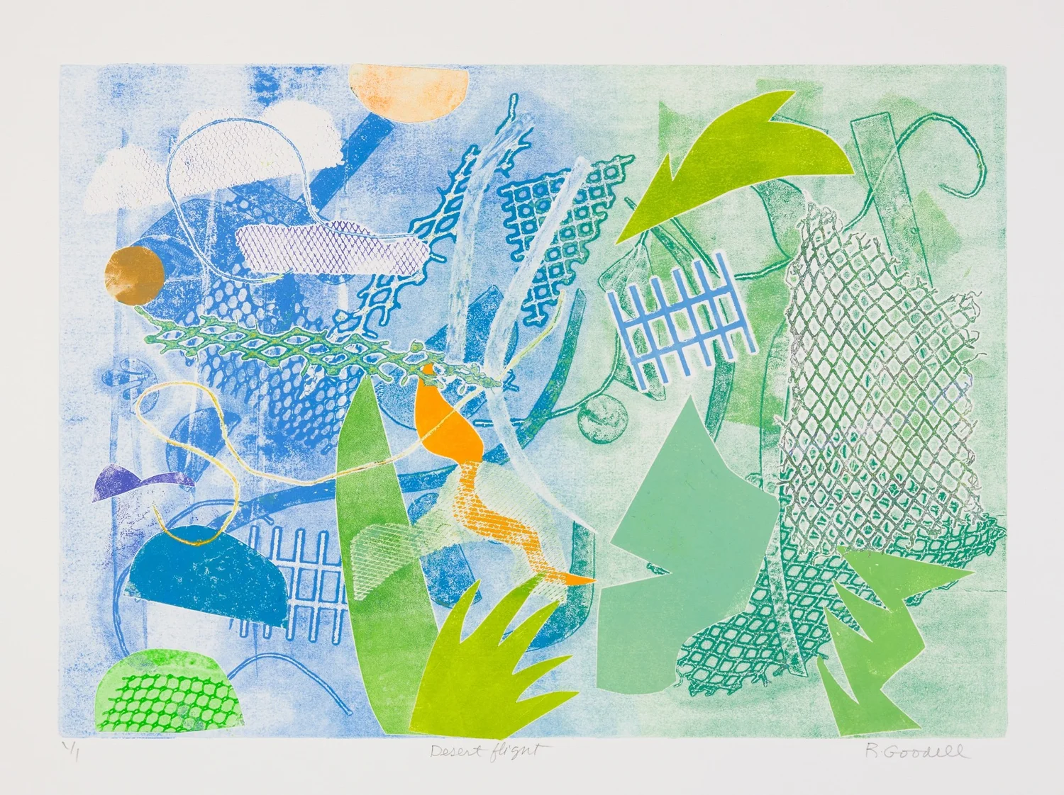 Desert Flight   Monoprint on BFK Paper  Signed, titled and numbered “1/1”  15 x 21 in., image size; 22 x 30 in., paper    Click to Inquire