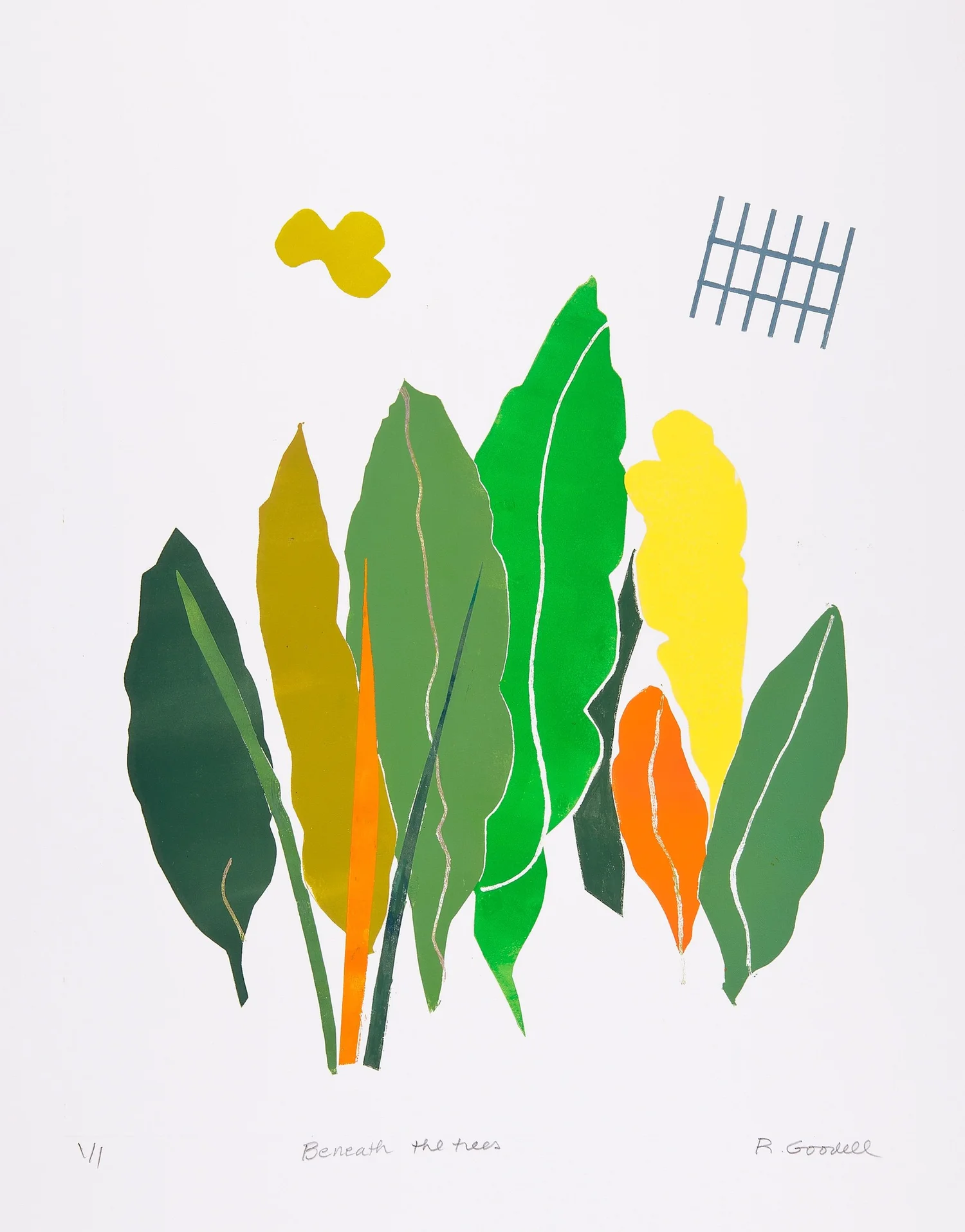 Beneath the Trees   Monoprint on BFK Paper  Signed, titled and numbered “1/1”  20 x 16 in., image size; 30 x 22 in., paper     Click to Inquire